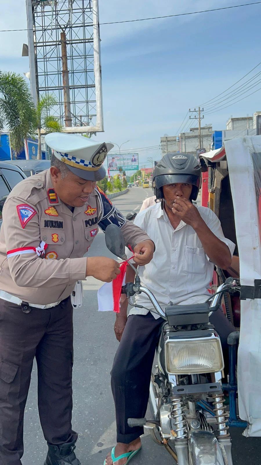 “Satuan Lalu Lintas bersama personel Sat Lantas Polres Bireuen hari ini berbagi bendera ke pengendara,” kata Kasat Lantas.