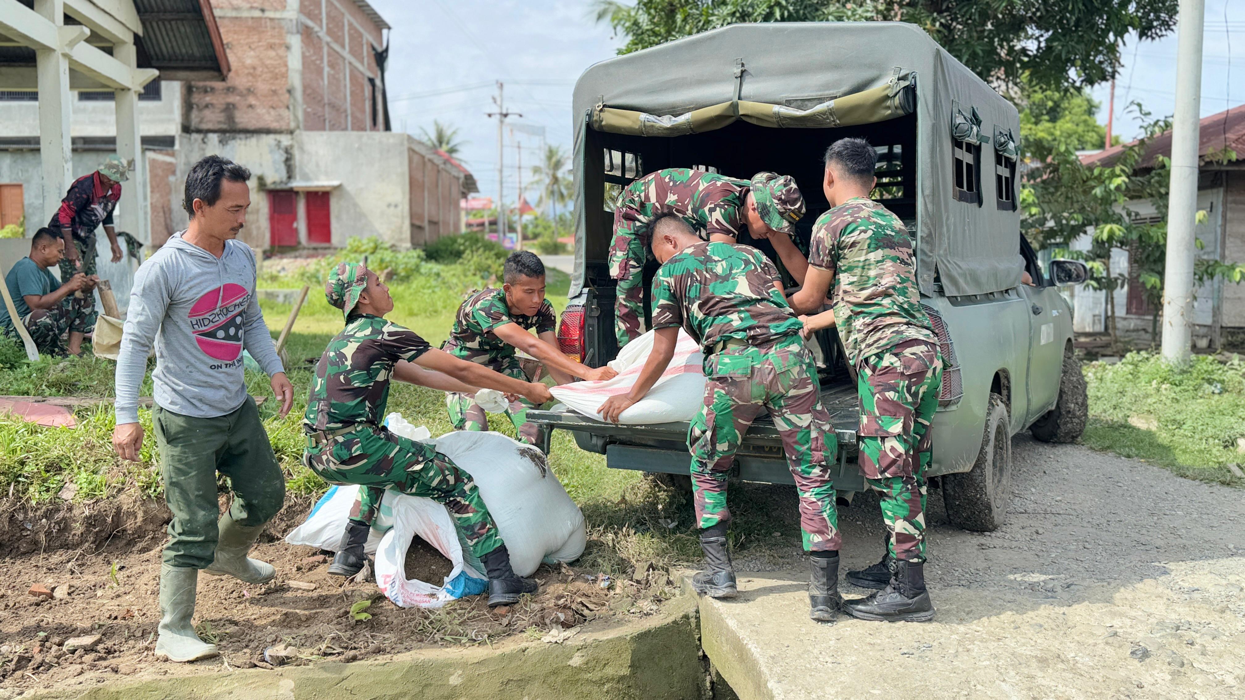 Elitnesia.id|Bireuen – Anggota Satgas TNI Manunggal Membangun Desa (TMMD) ke-123 Kodim 0111/Bireuen terus menunjukkan dedikasinya dalam membantu masyarakat dengan menyiapkan bahan material pasir untuk pembuatan sumur bor di Desa Meunasah Pulo, Kecamatan Peudada, Kabupaten Bireuen. Rabu (12/03/2025).